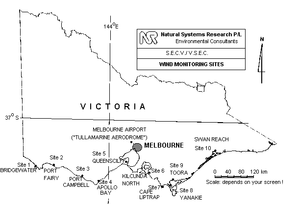 Two years of monitoring in a study to evaluate the potential for wind-powered electricity generation at ten sites along the coast of Victoria have produced the following ranking of sites (with annual average wind energy fluxes at l0m in W/m2):