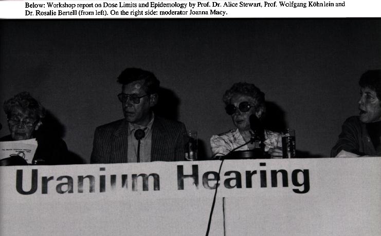 Workshop Report by Prof. Wolfgang Köhnlein, Dr. Alice Stewart and Dr. Rosalie BertellProf W. Köhnlein, Fed Rep. of Germany. Scientist. -- Dr. R. Bertell, Ontario, Canada. Statistician at the Int. Inst. of Concern for Public Health, Toronto; Winner of the Alternative Nobel Prize (low-level radiation), nun.