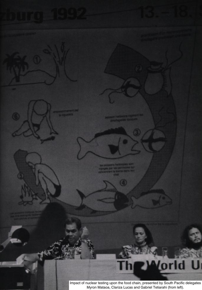 There is no time left to tell you about the economic consequences of the small financial compensation that our people get in return for these killing tests. But in this little time left, I want to assure you that the resistance of the Non-Governmental Organizations in our liquid continent to the atomic experiments is a part of the inalienable and indescriptive right of my people, and only of my people, to dispose of its political, economical, social and cultural space. France has no right at all to refuse this evidence. France does not promote human rights, it just insults them. Referring to what I've been told by my friends of the Pacific that are here today and by all aboriginal peoples, I think that we have the right to protest. Our dreams and the aboriginal vision of our Pacific, our Original Mother, our women, our children, tell us to take both juridic and prophetic initiatives.